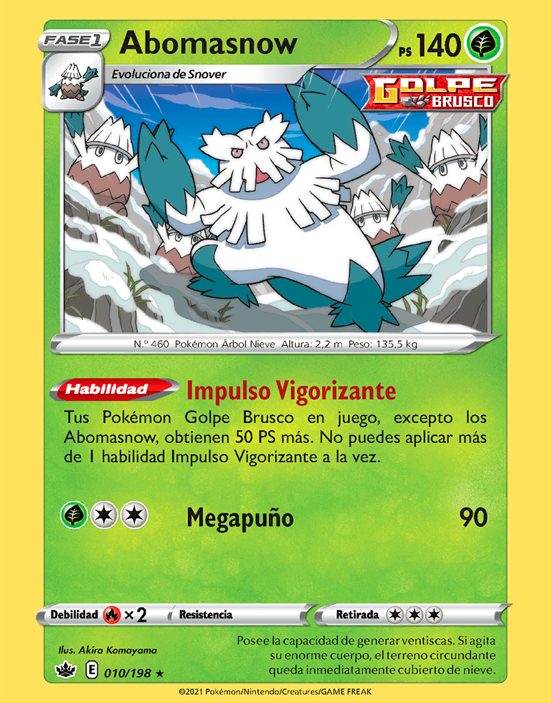 | Tus Pokémon Golpe Brusco en juego, excepto los Abomasnow, obtienen 50 PS más. No puedes aplicar más de 1 habilidad Impulso Vigorizante a la vez. | |