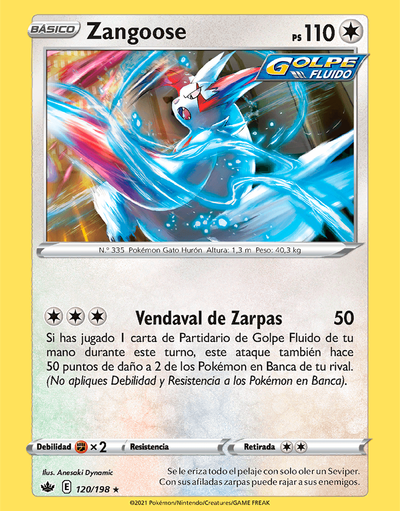 Vendaval de Zarpas Si has jugado una carta de Partidario de Golpe Fluido de tu mano durante este turno, este ataque también hace 50 puntos de daño a 2 de los Pokémon en Banca de tu rival. (No apliques Debilidad y Resistencia a los Pokémon en Banca). |