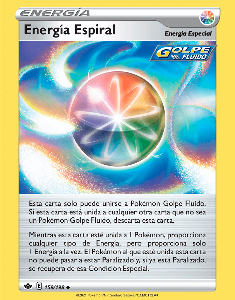 Esta carta solo puede unirse a Pokémon Golpe Fluido. Si esta carta está unida a cualquier otro Pokémon que no sea un Pokémon Golpe Fluido, descarta esta carta. Mientras esta carta esté unida a 1 Pokémon, proporciona cualquier tipo de Energía, pero proporciona solo 1 Energía a la vez. El Pokémon al que esté unida esta carta no puede pasar a estar Paralizado y, si ya está Paralizado, se recupera de esa Condición Especial. |