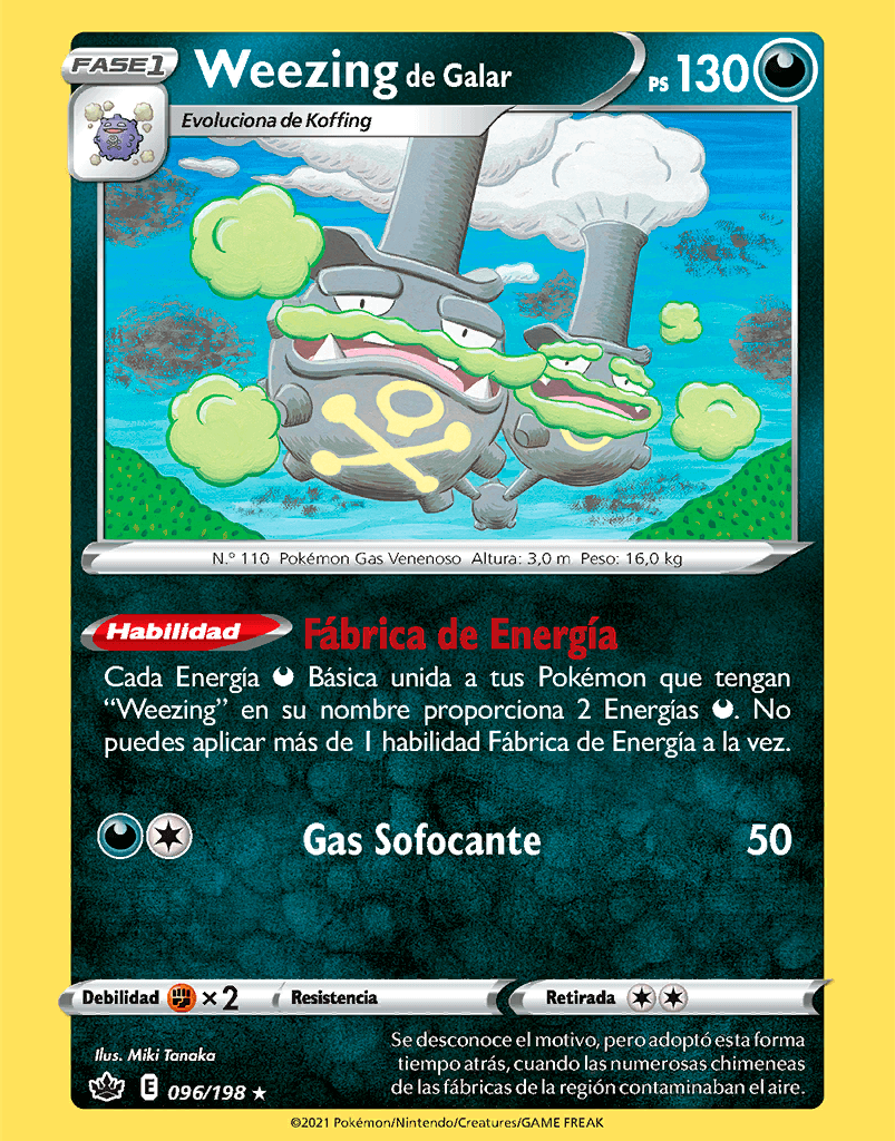 | Cada Energía Básica unida a tus Pokémon que tengan “Weezing” en su nombre proporciona 2 Energías . No puedes aplicar más de 1 habilidad Fábrica de Energía a la vez. | |