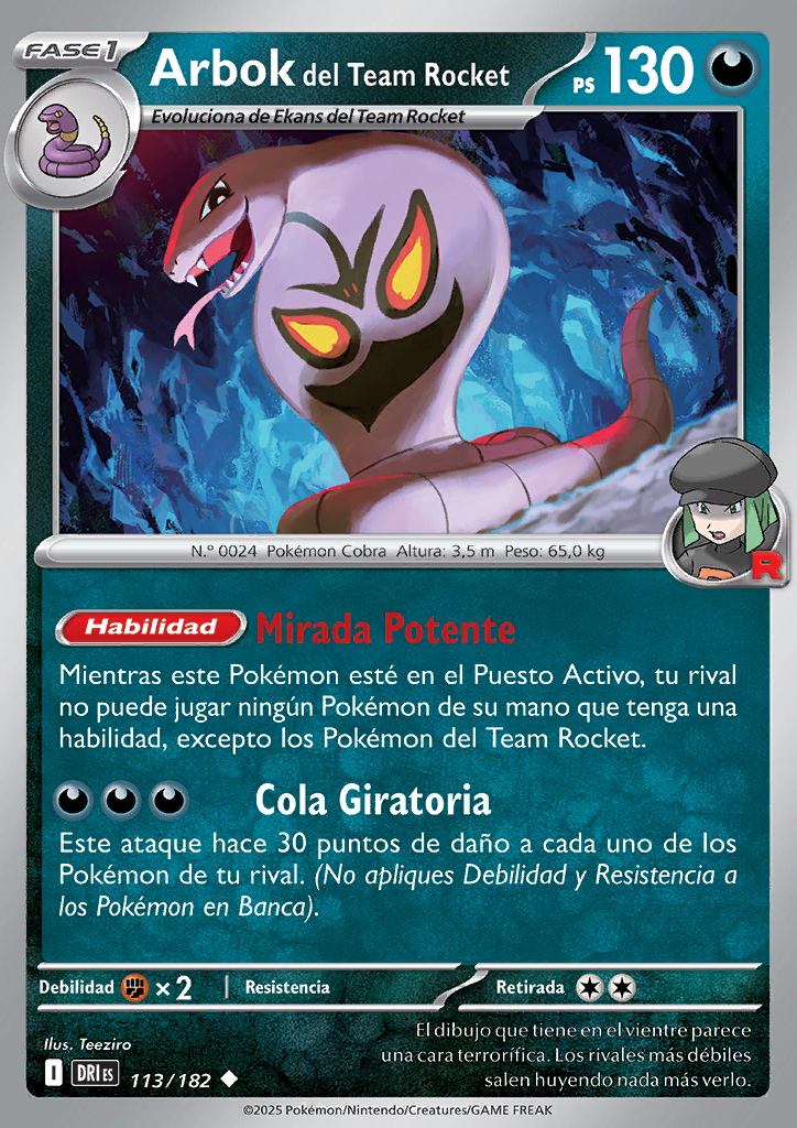 | Mientras este Pokémon esté en el Puesto Activo, tu rival no puede jugar ningún Pokémon de su mano que tenga una habilidad, excepto los Pokémon del Team Rocket. | |