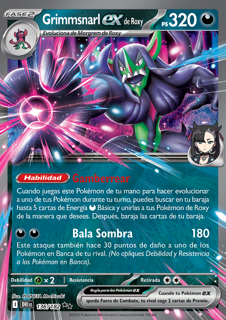 | Cuando juegas este Pokémon de tu mano para hacer evolucionar a uno de tus Pokémon durante tu turno, puedes buscar en tu baraja hasta 5 cartas de Energía Básica y unirlas a tus Pokémon de Roxy de la manera que desees. Después, baraja las cartas de tu baraja. | |