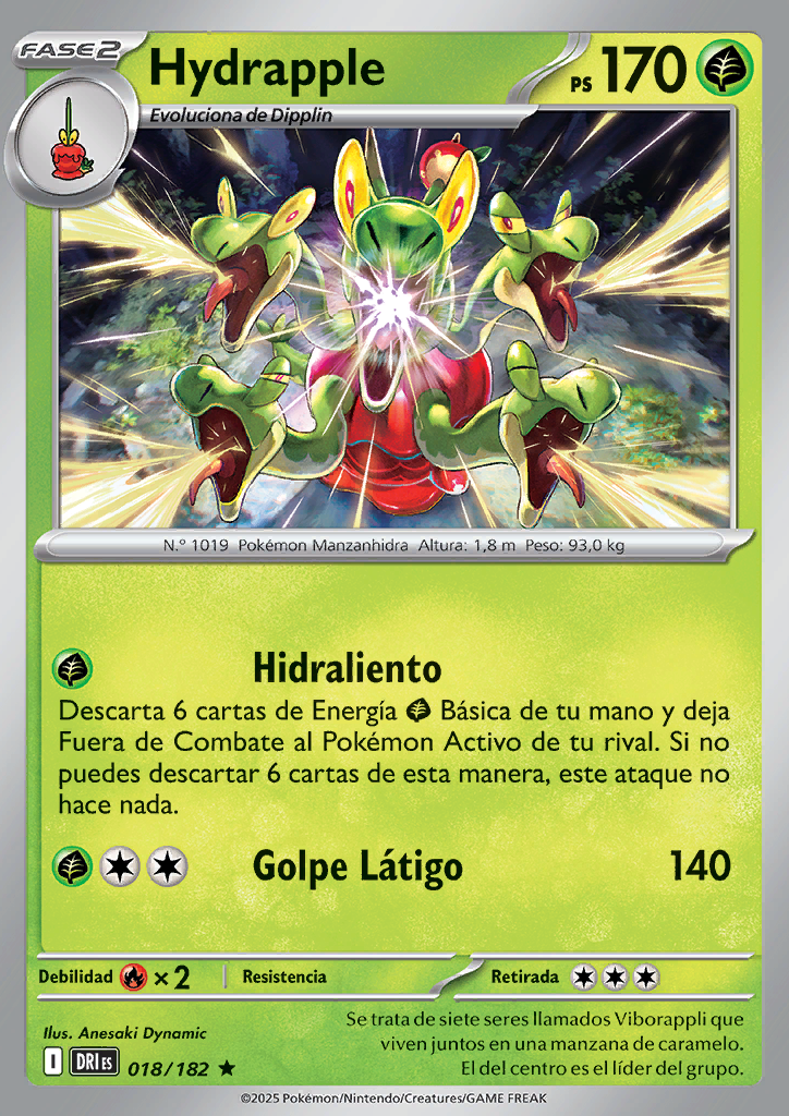 Hidraliento Descarta 6 cartas de Energía Básica de tu mano y deja Fuera de Combate al Pokémon Activo de tu rival. Si no puedes descartar 6 cartas de esta manera, este ataque no hace nada. |