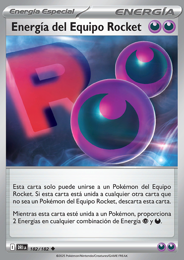 Esta carta solo puede unirse a un Pokémon del Team Rocket. Si esta carta está unida a cualquier otra carta que no sea un Pokémon del Team Rocket, descarta esta carta. Mientras esta carta esté unida a un Pokémon, proporciona un total de 2 Energías, y , en cualquier combinación. |