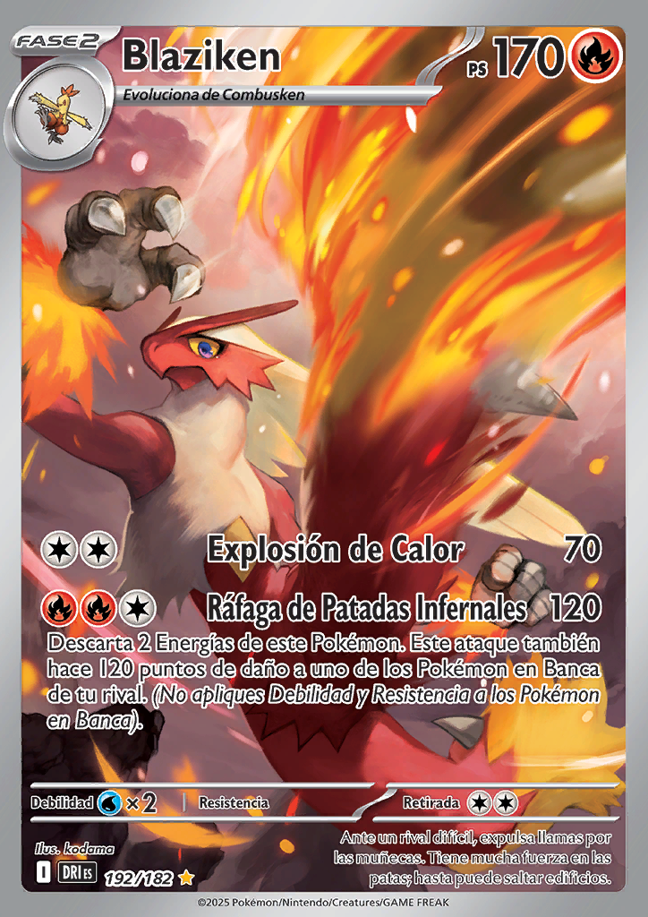 Ráfaga de Patadas Infernales Descarta 2 Energías de este Pokémon. Este ataque también hace 120 puntos de daño a uno de los Pokémon en Banca de tu rival. (No apliques Debilidad y Resistencia a los Pokémon en Banca). |
