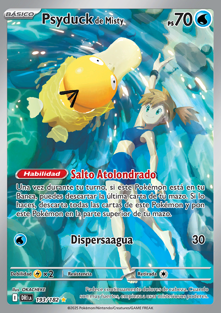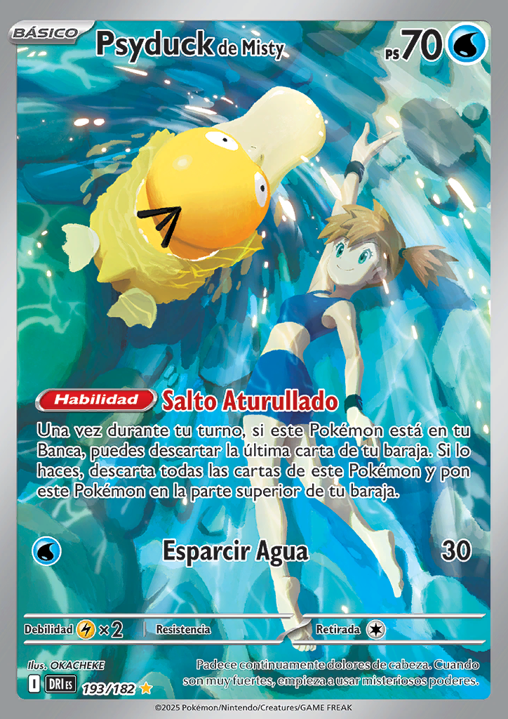 | Una vez durante tu turno, si este Pokémon está en tu Banca, puedes descartar la última carta de tu baraja. Si lo haces, descarta todas las cartas de este Pokémon y pon este Pokémon en la parte superior de tu baraja. | |