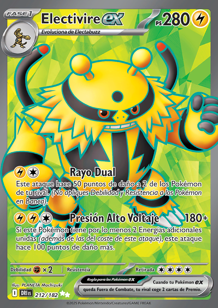 Presión Alto Voltaje Si este Pokémon tiene por lo menos 2 Energías adicionales unidas (además de las del coste de este ataque), este ataque hace 100 puntos de daño más. |