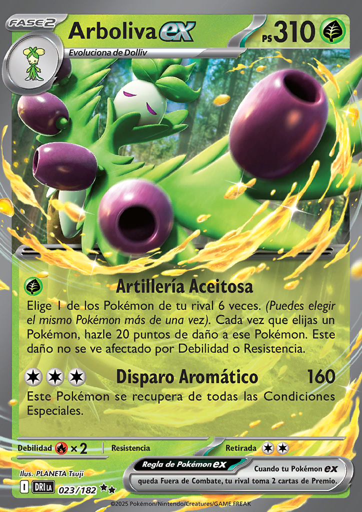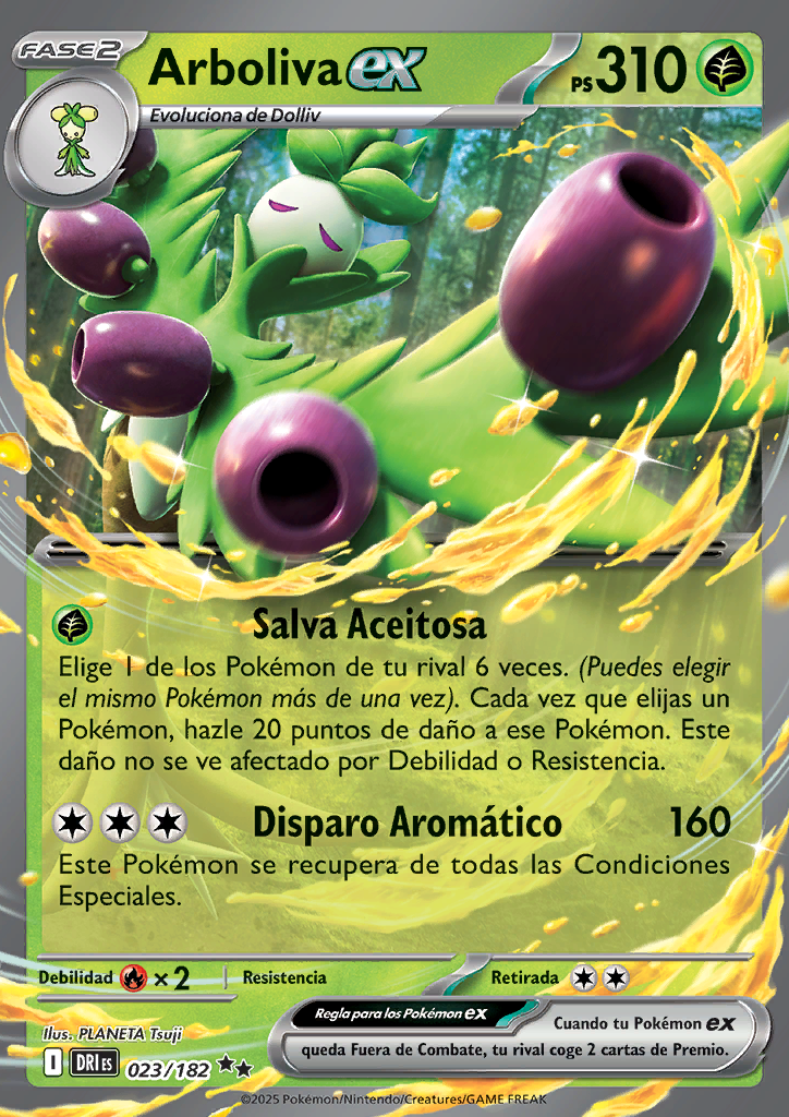 Salva Aceitosa Elige 1 de los Pokémon de tu rival 6 veces. (Puedes elegir el mismo Pokémon más de una vez). Cada vez que elijas un Pokémon, hazle 20 puntos de daño a ese Pokémon. Este daño no se ve afectado por Debilidad o Resistencia. |