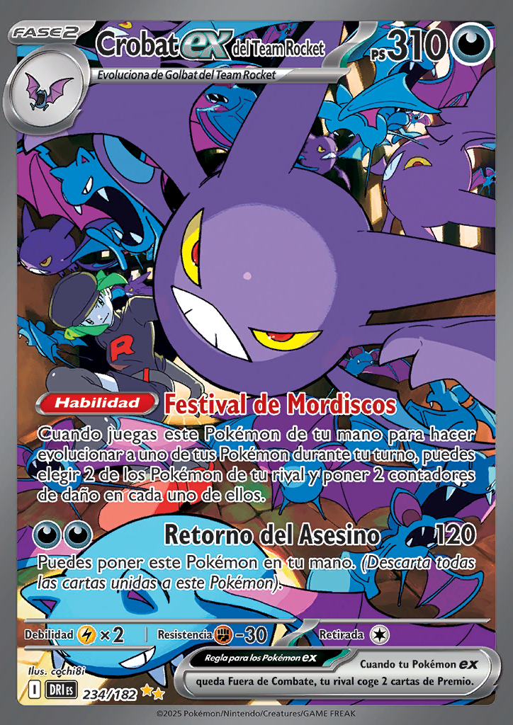 | Cuando juegas este Pokémon de tu mano para hacer evolucionar a uno de tus Pokémon durante tu turno, puedes elegir 2 de los Pokémon de tu rival y poner 2 contadores de daño en cada uno de ellos. | |