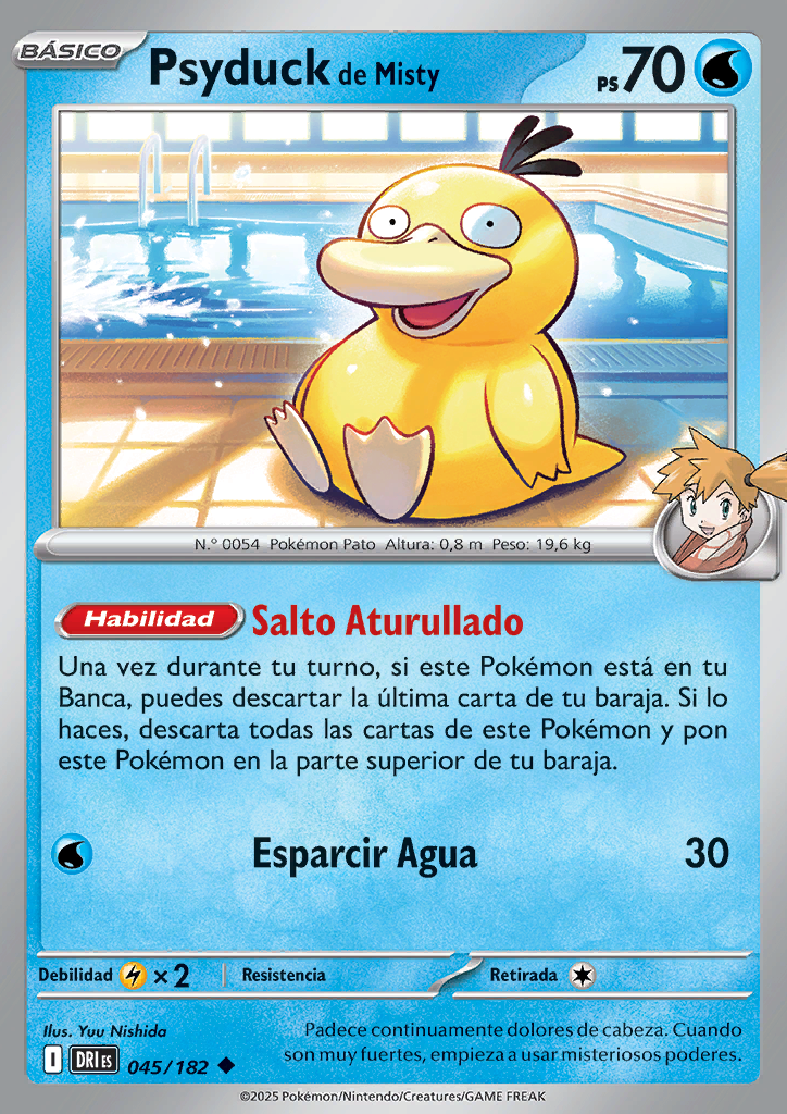 | Una vez durante tu turno, si este Pokémon está en tu Banca, puedes descartar la última carta de tu baraja. Si lo haces, descarta todas las cartas de este Pokémon y pon este Pokémon en la parte superior de tu baraja. | |