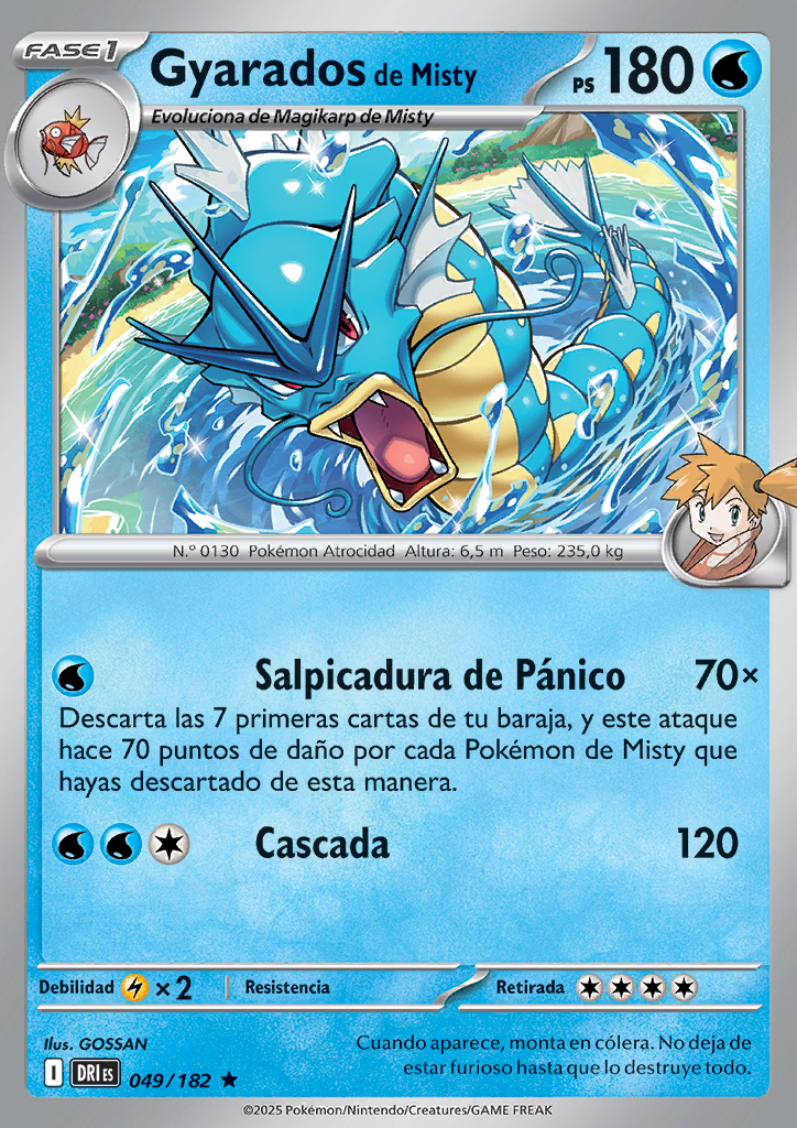 Salpicadura de Pánico Descarta las 7 primeras cartas de tu baraja, y este ataque hace 70 puntos de daño por cada Pokémon de Misty que hayas descartado de esta manera. |