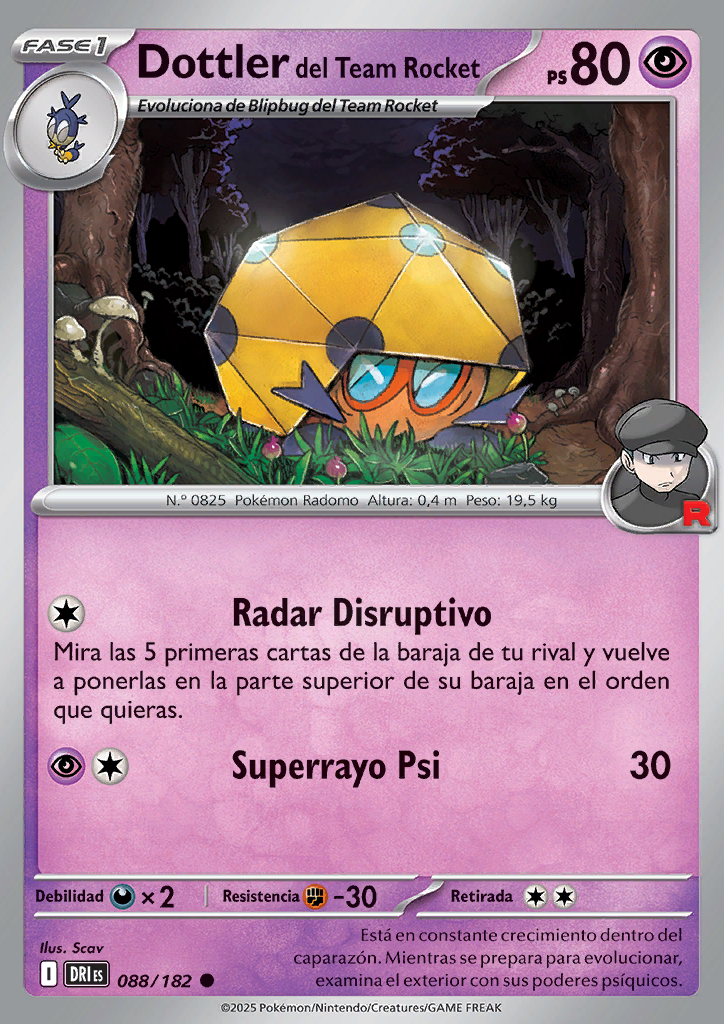 Radar Disruptivo Mira las 5 primeras cartas de la baraja de tu rival y vuelve a ponerlas en la parte superior de su baraja en el orden que quieras. |