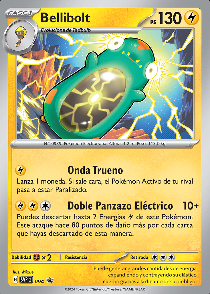 Doble Panzazo Eléctrico Puedes descartar hasta 2 Energías de este Pokémon. Este ataque hace 80 puntos de daño más por cada carta que hayas descartado de esta manera. |