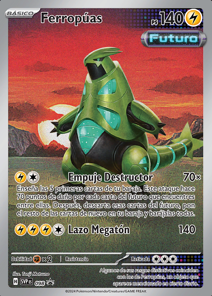 Empuje Destructor Enseña las 5 primeras cartas de tu baraja. Este ataque hace 70 puntos de daño por cada carta del futuro que encuentres entre ellas. Después, descarta esas cartas del futuro, pon el resto de las cartas de nuevo en tu baraja y barájalas todas. |