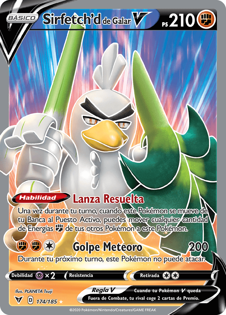 Cuando tu Pokémon V queda Fuera de Combate, tu rival coge 2 cartas de Premio. |